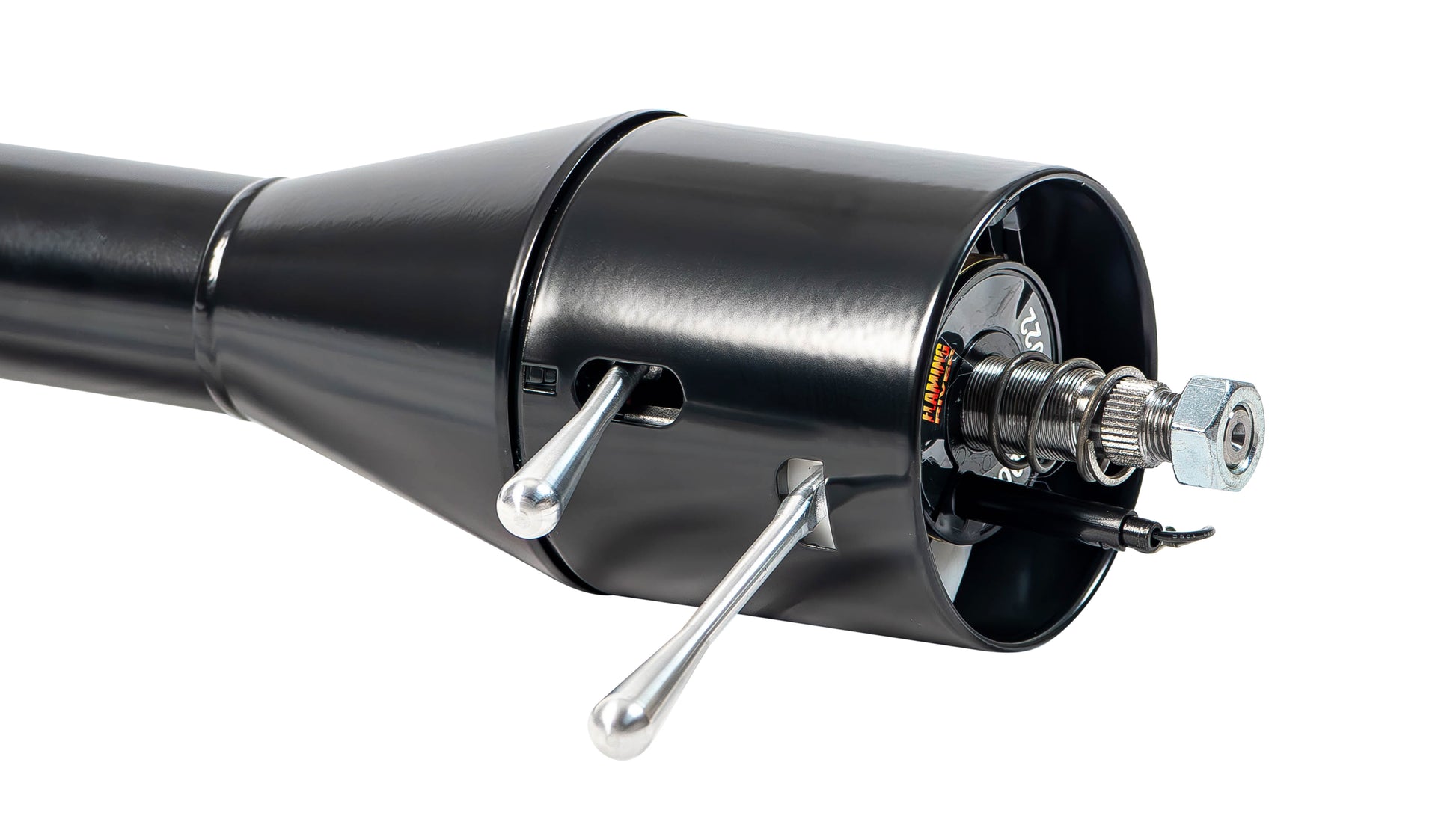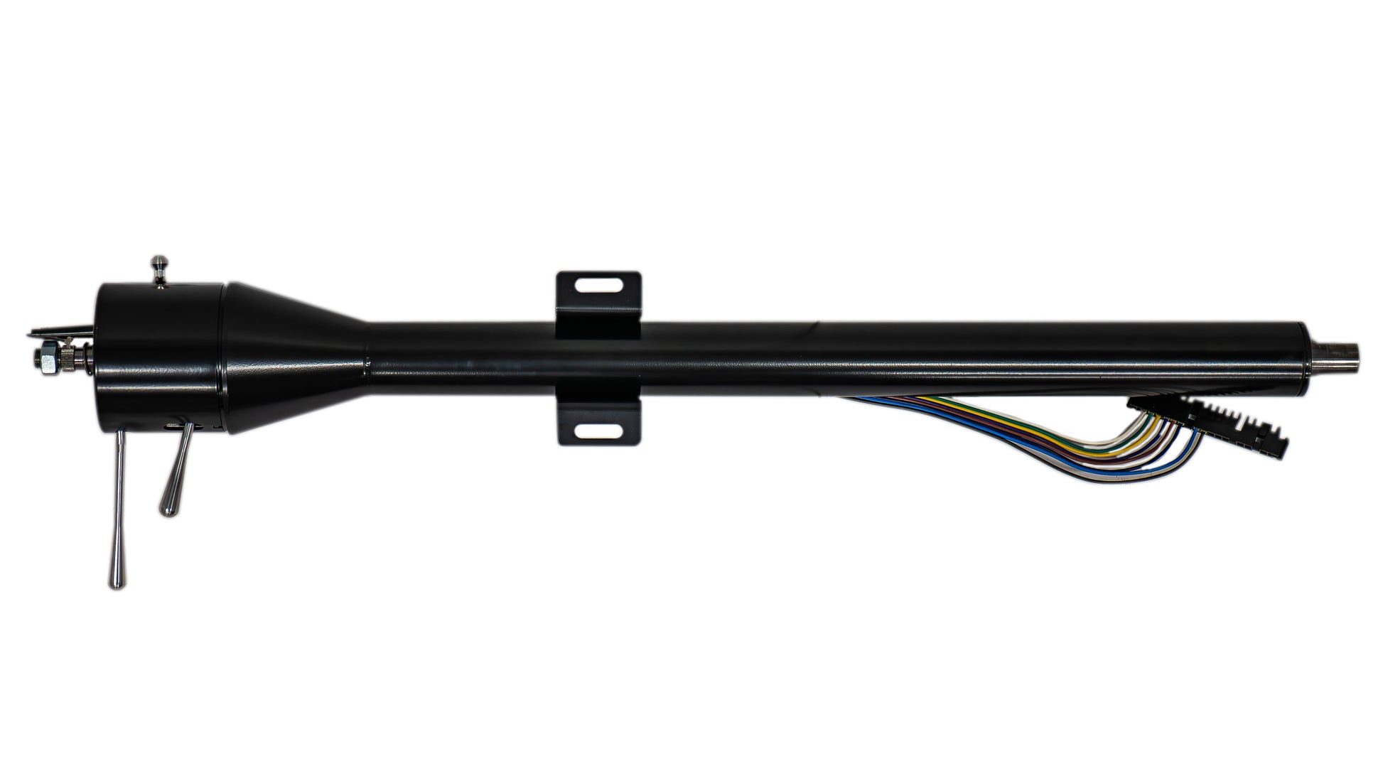 Black steel tilt steering column for 66-77 Ford Broncos with floor shift transmission.