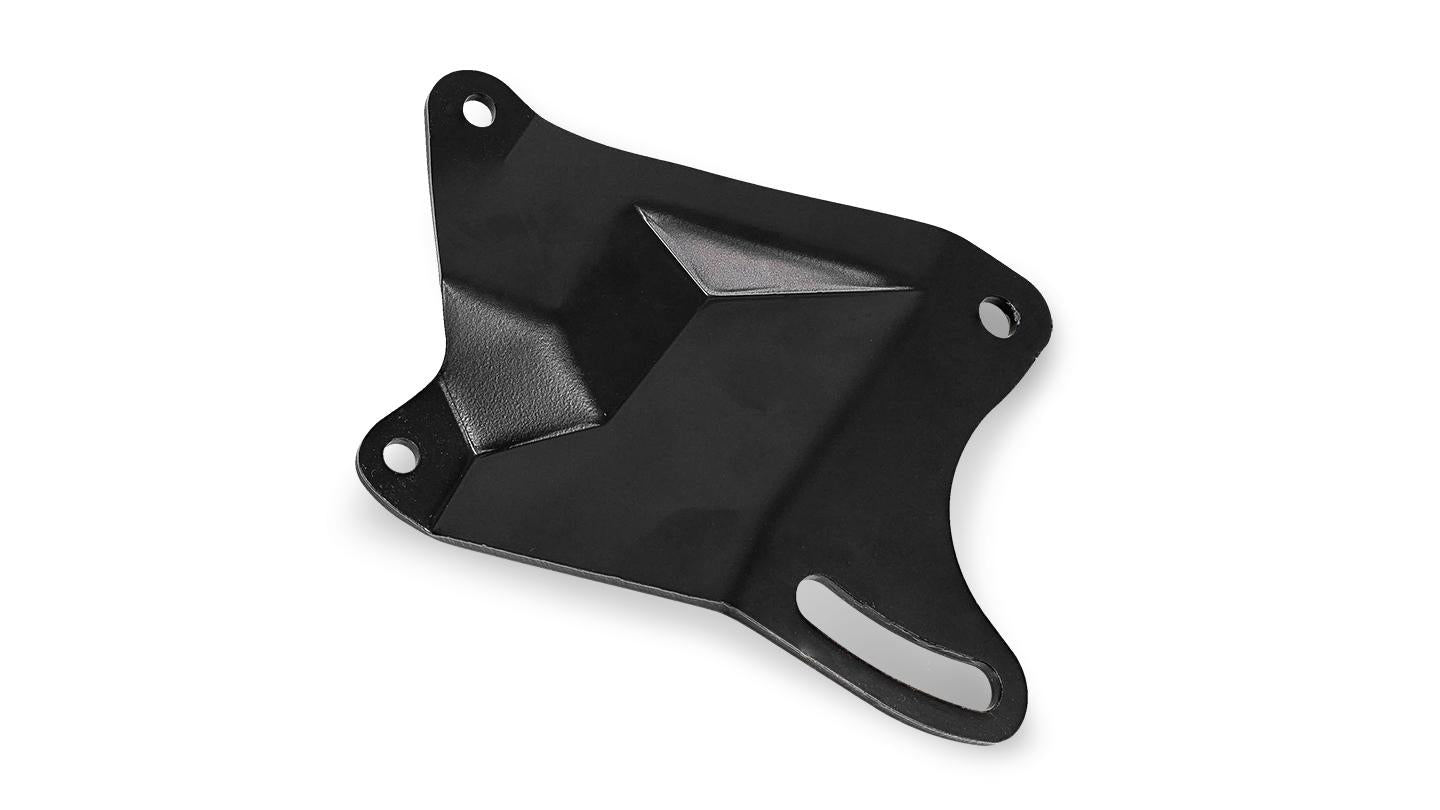 Power Steering Pump Tension Adjusting Bracket for 1966-77 Ford Broncos with 289, 302 or 351W V8 engine. This bracket is stamped just like the factory original and laser cut for precision fitment. It is clearanced slightly to allow for either stock Ford or aftermarket Saginaw style power steering pumps. Powder-coated black. Made exclusively for TOMS OFFROAD