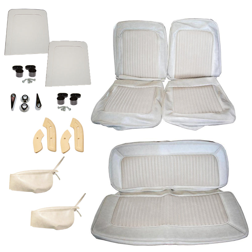 This is complete set of seat covers for your 68-77 Ford Bronco. This deluxe kit includes all the parts needed for reupholstery (we do recommend also purchasing new seat foam). Excellent quality seat covers. Covers front and rear. Parchment vinyl material. Includes OE style plastic seat backings for fronts with clips. Also includes rear arm rest covers, chrome seat hinge levers, seat hinge covers and seat bumpers.
