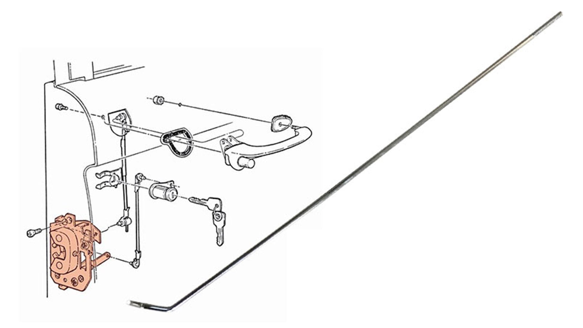 New Passenger Side Door Latch to Lock Pull Knob Actuating Rod for 1968-77 Ford Broncos. This rod fits the passenger door and connects the Lock Knob to the Door Latch. When you pull the door lock knob, this rod pulls on a lever on the door latch to unlock the latch. When you push on the door lock knob, the same lever is pushed in which in turn locks the latch. This is a TOMS OFFROAD Exclusive!!! Don't forget to purchase a couple door rod bushings to be used when installing this door latch rod.