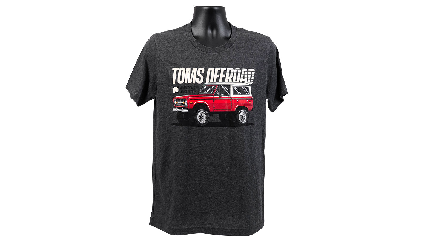 New TOMS OFFROAD t-shirt in charcoal heather gray. Features a side profile classic SUV with the TOMS OFFROAD logo above it and the text "Quality Parts Since 1976."