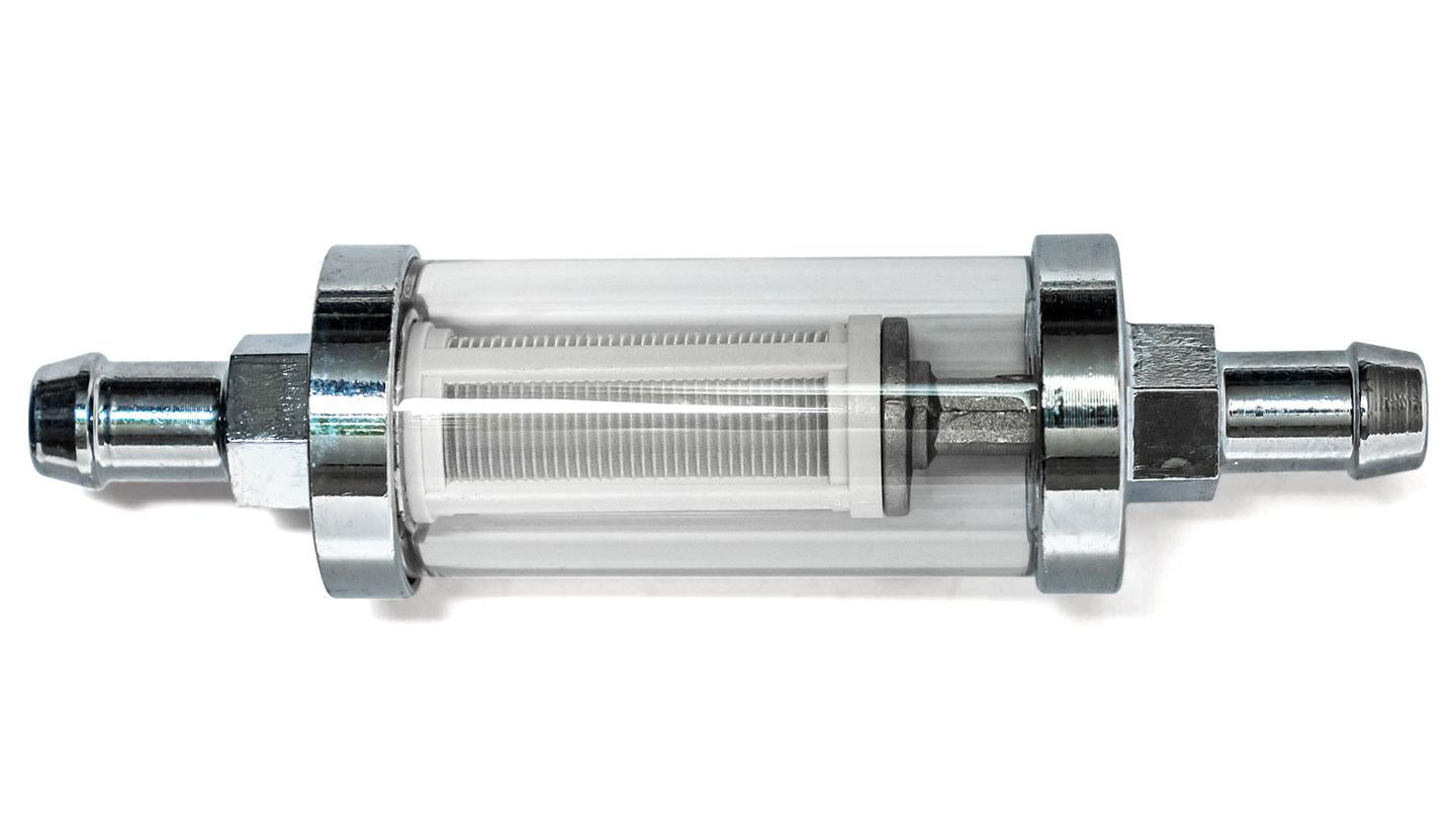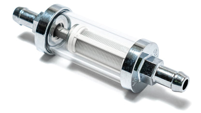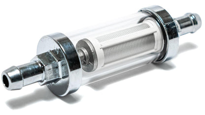 Clear glass inline fuel filter for your carbureted engine setup. This fuel filter is great in that it gives you the ability to see that the gas is running properly into your carburetor with a simple glance. 3/8 inch inlet and outlet.