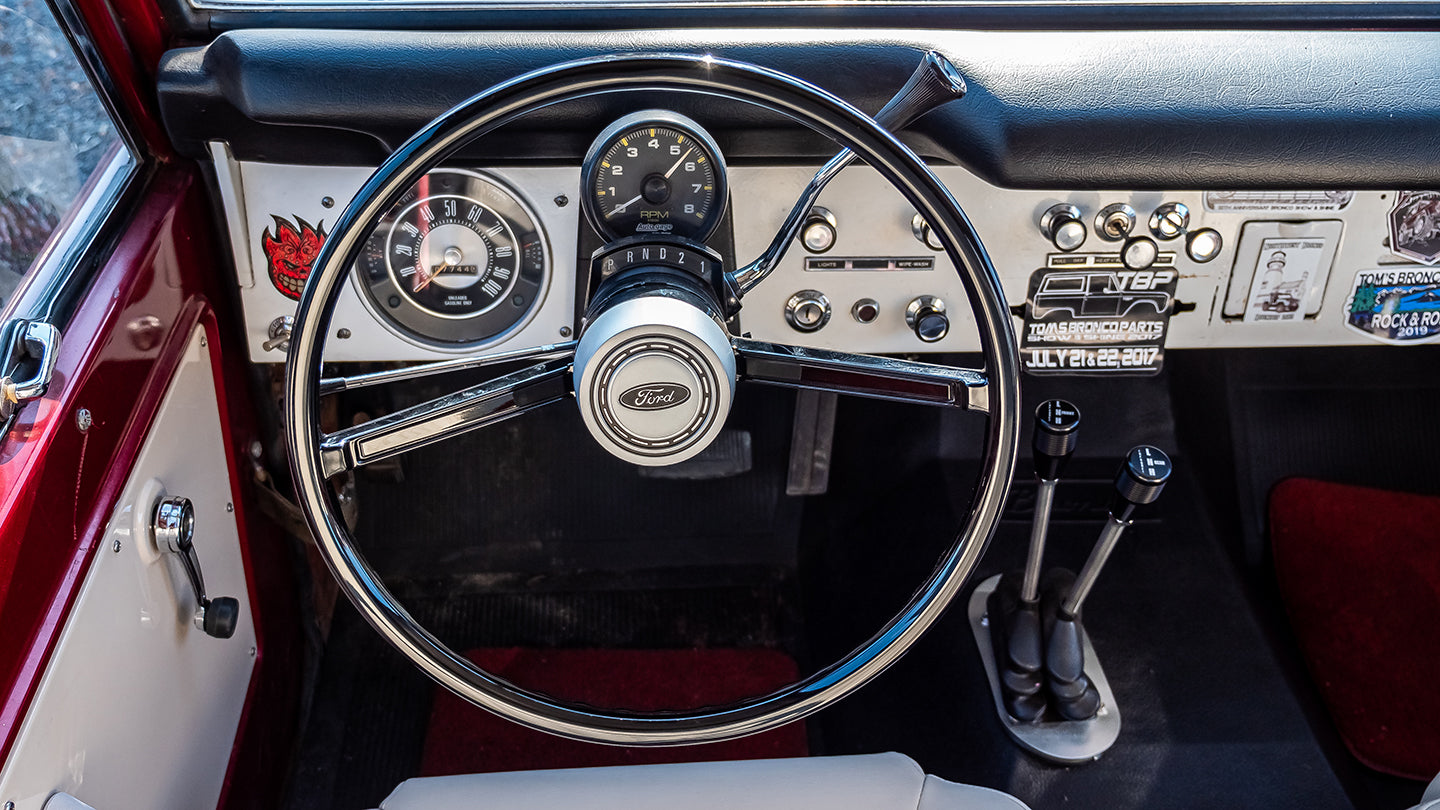 TOMS OFFROAD Sport style, 14.5 inch early Bronco steering wheel. This is a great reproduction steering wheel for your Ford Bronco with a modern twist. This steering wheel is modeled after the factory 1966-73 Ford Bronco steering wheel but has been sized down to make it a much more comfortable wheel to drive with. This new design is exclusive to TOMS OFFROAD and is great for use in early Broncos with power steering. You can now climb into the Bronco without hitting your knees on the factory steering wheel while still maintaining that original look.