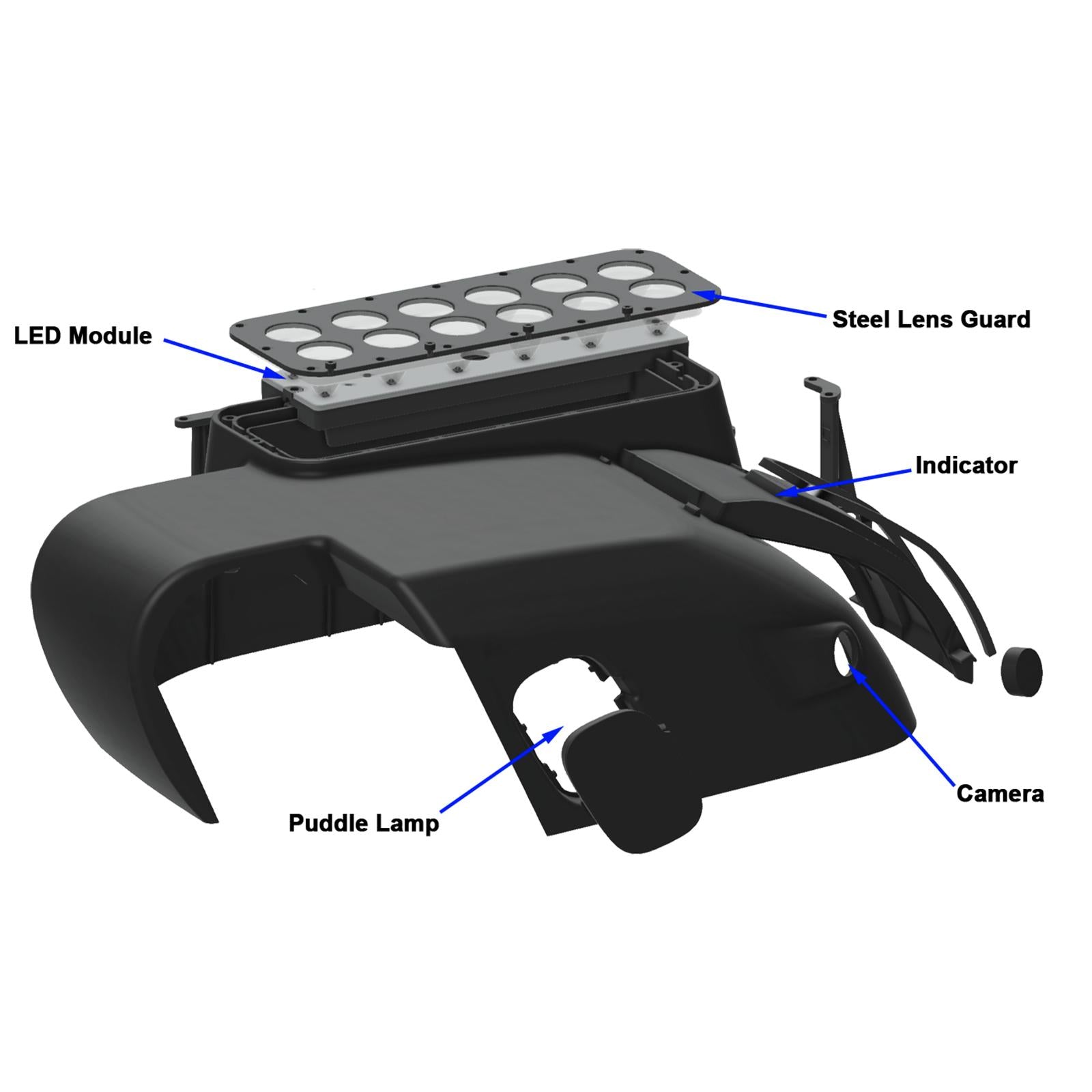 The housing material is made from rugged Polycarbonate which is 2x stronger than the factory ABS housing- and bolts onto the vehicle using the factory mounts for easy installation. A set of anodized rock guards protects the LED acrylic lenses, which also houses the DBM Reflex LED optics. These efficient optics focus the light for optimal visibility from the driver seat position.