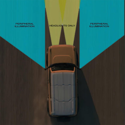 Why is peripheral illumination important? Factory headlights and most auxiliary lights only illuminate the area in front of the vehicle. Ideally for off-road activities, such as trail riding, the driver needs to be able to clearly see the area on the sides of the trail to spot obstructions, which would otherwise go unnoticed and could be a potential hazard.