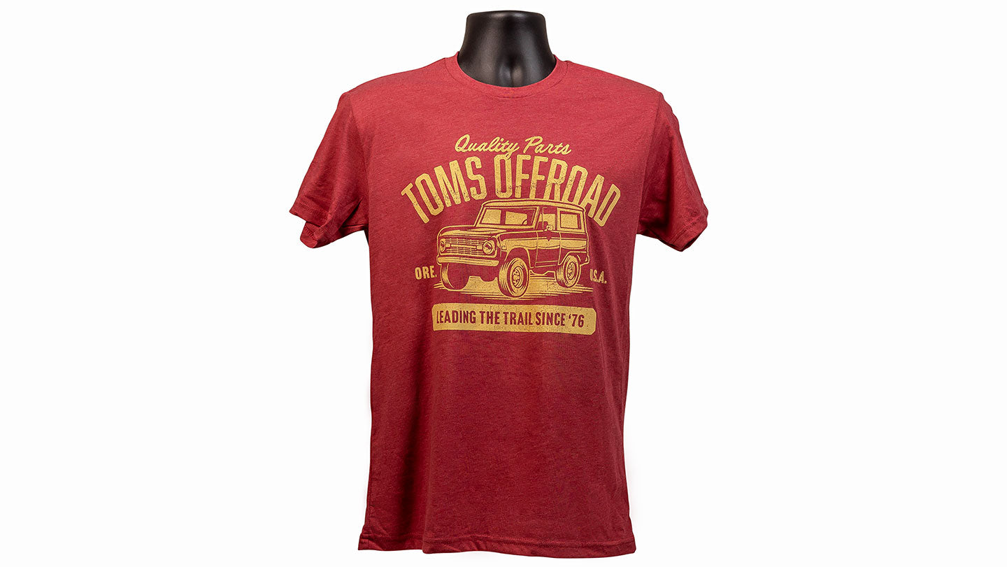 Represent decades of Bronco heritage with the Leading the Trail Since '76 Quality Parts T-Shirt. Featuring a classic garage-inspired design, this cardinal red tee delivers vintage style with a bold nod to TOMS OFFROAD's long-standing commitment to quality Bronco parts and culture.